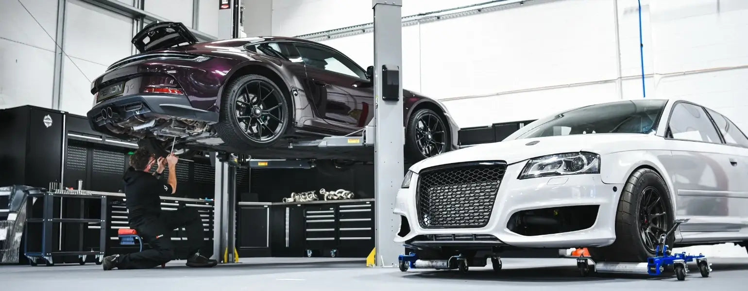 A Porsche 911 GT3 Touring from Newcastle has an Akrapovic Slip-On Race Line (Titanium) performance exhaust system installed in PERON's Performance Workshop.